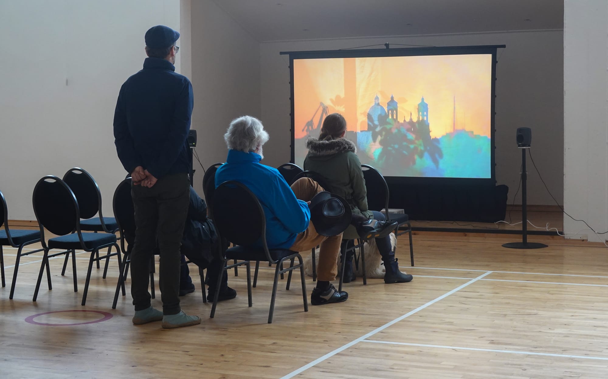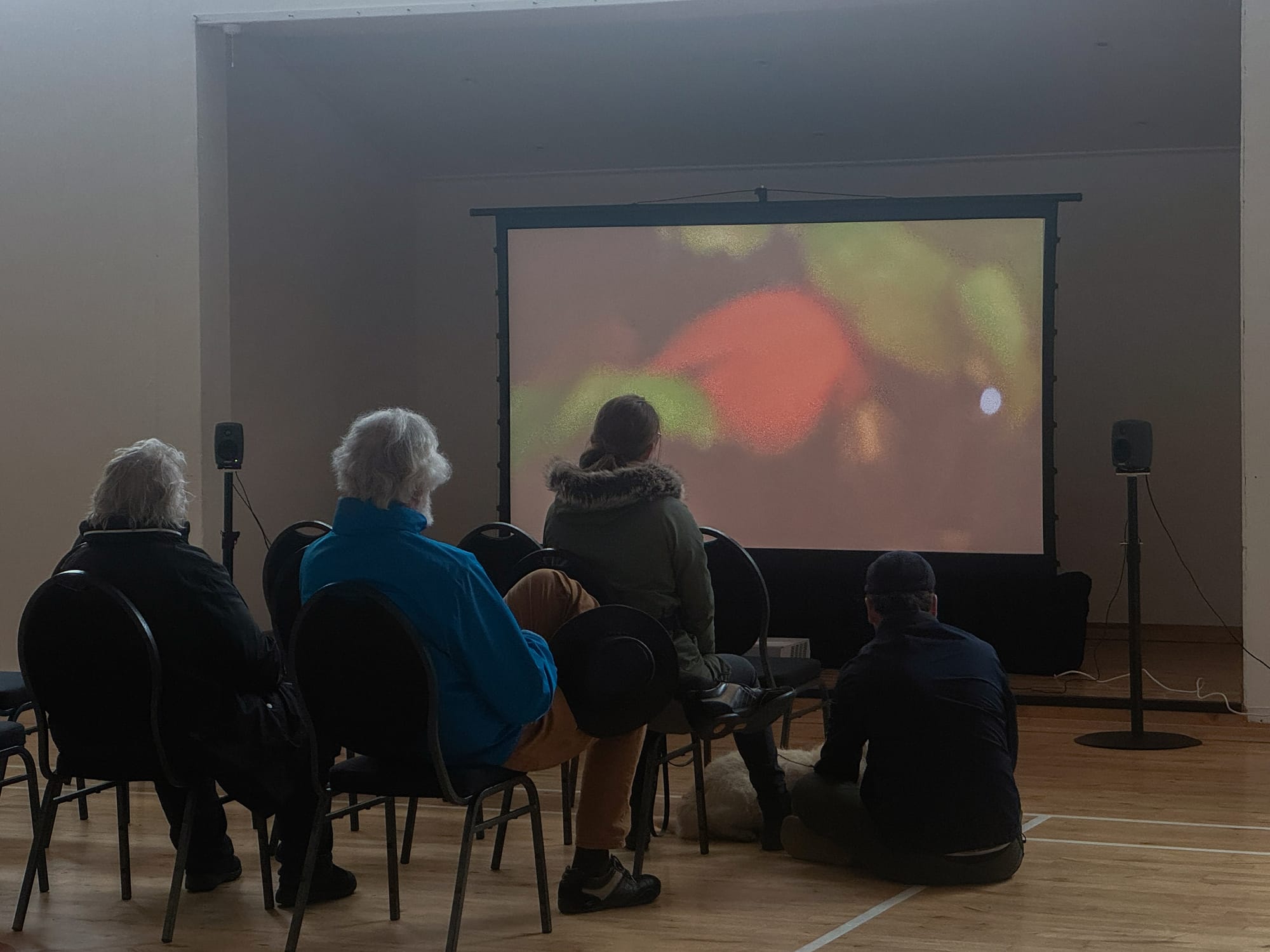 ID: a group of people sitting on chairs and floor and standing, with a white dog lying next to them, watching projected films in a community hall. A pair of speakers visible on the sides of the screen.